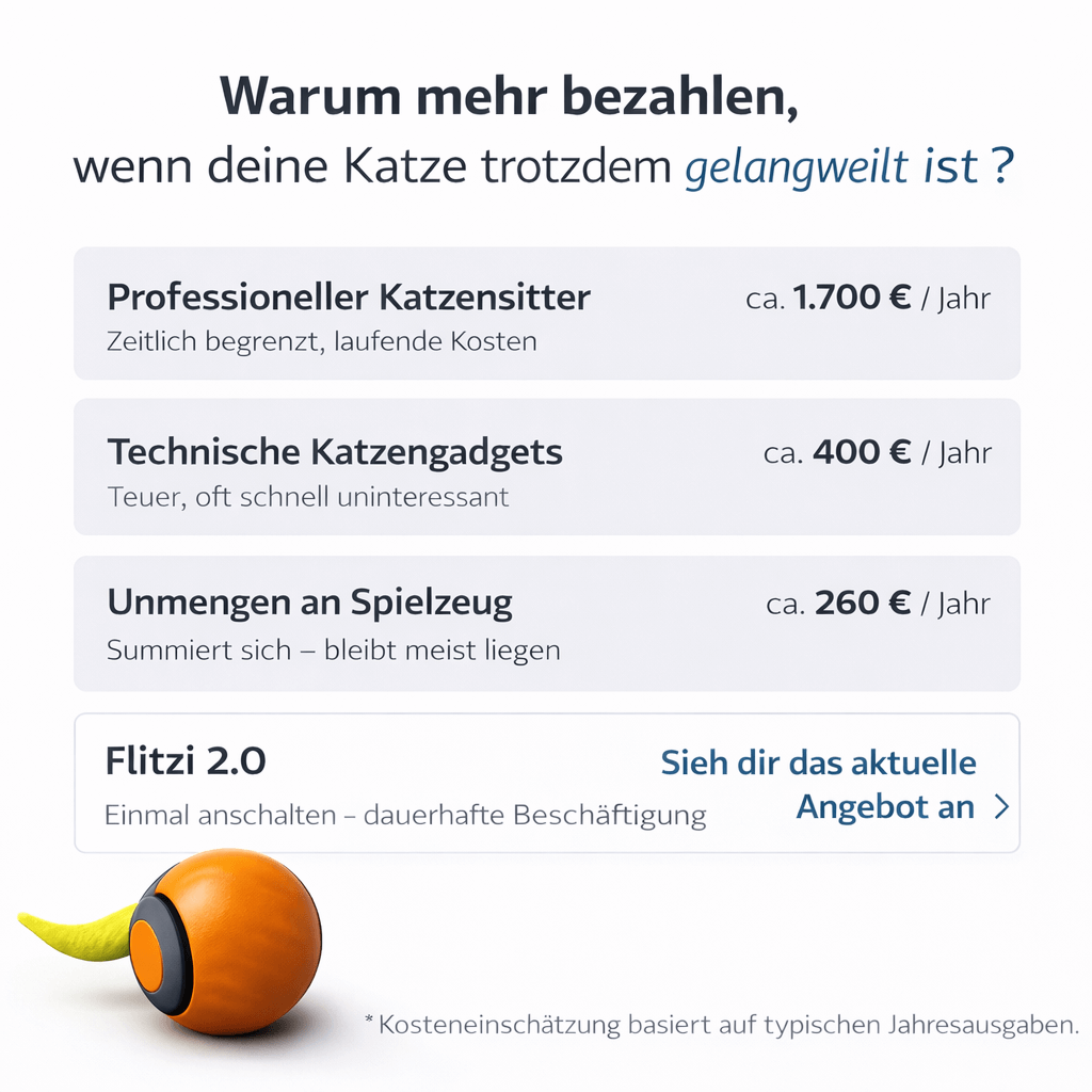 Viele Katzenspielzeuge nutzen sich schnell ab, werden langweilig oder funktionieren nur, wenn du aktiv mitspielst. Flitzi 2.0 beschäftigt deine Katze selbstständig- dauerhaft und zuverlässig.